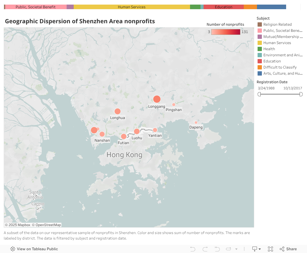 The interactive map below displays the distribution of a randomly selected group of nonprofits in Shenzhen. Participants in the the study will gain access to a password protected site to explore the various characteristics (size, age, issue area) of themselves in comparison to their nonprofit peers.