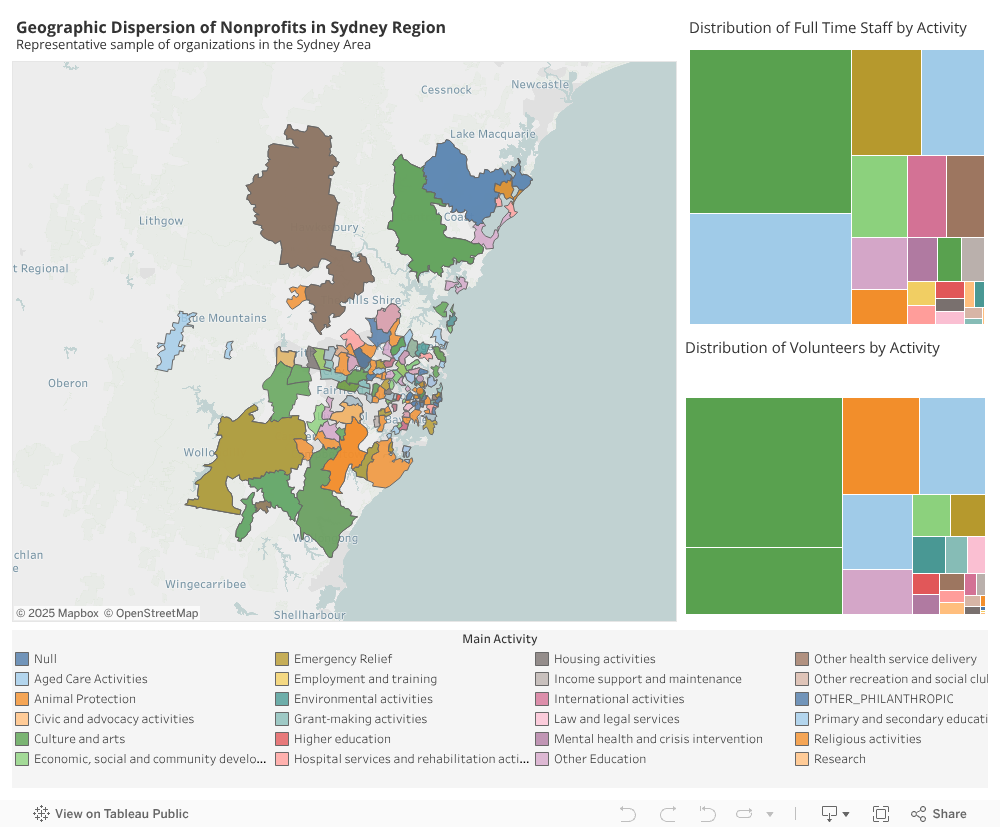The interactive map below displays the distribution of a randomly selected group of nonprofits in Sydney. Participants in the the study will gain access to a password protected site to explore the various characteristics (size, age, issue area) of themselves in comparison to their nonprofit peers.
